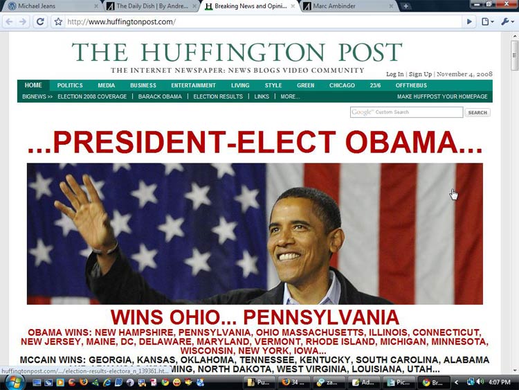 The Huffington Post – screen grab – 4:07PM 5/11/08 (UTC/GMT +13:00 Hours) – Cambridge NZ.