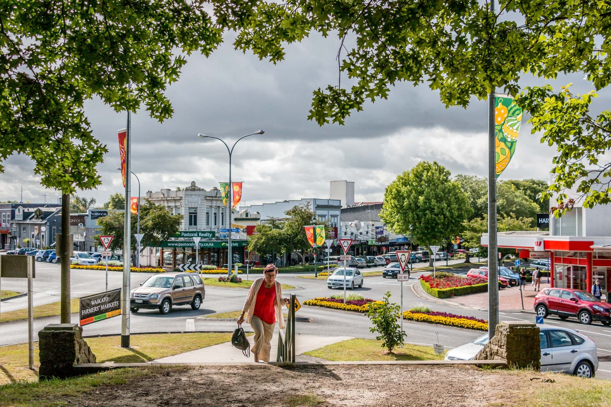 The Coronation Steps, on the Victoria Street Alpha Street corner of Victoria Square, Cambridge, New Zealand, feature two inscriptions: