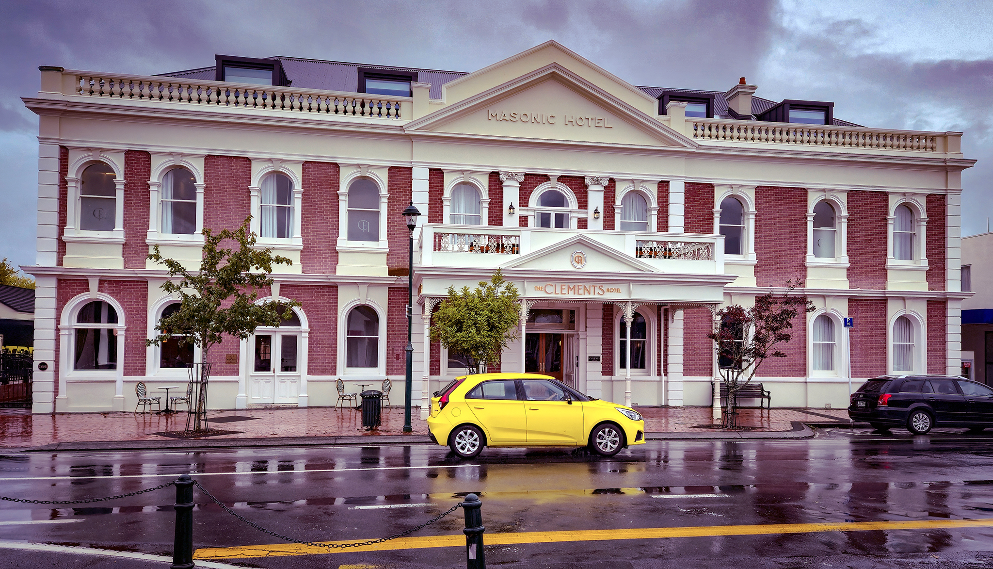 Thursday 26 March 2026 An enjoyed recent image (Thursday 26 March 2026) yellow car in front of The Clements Hotel on Duke Street Cambridge (previously SH1)